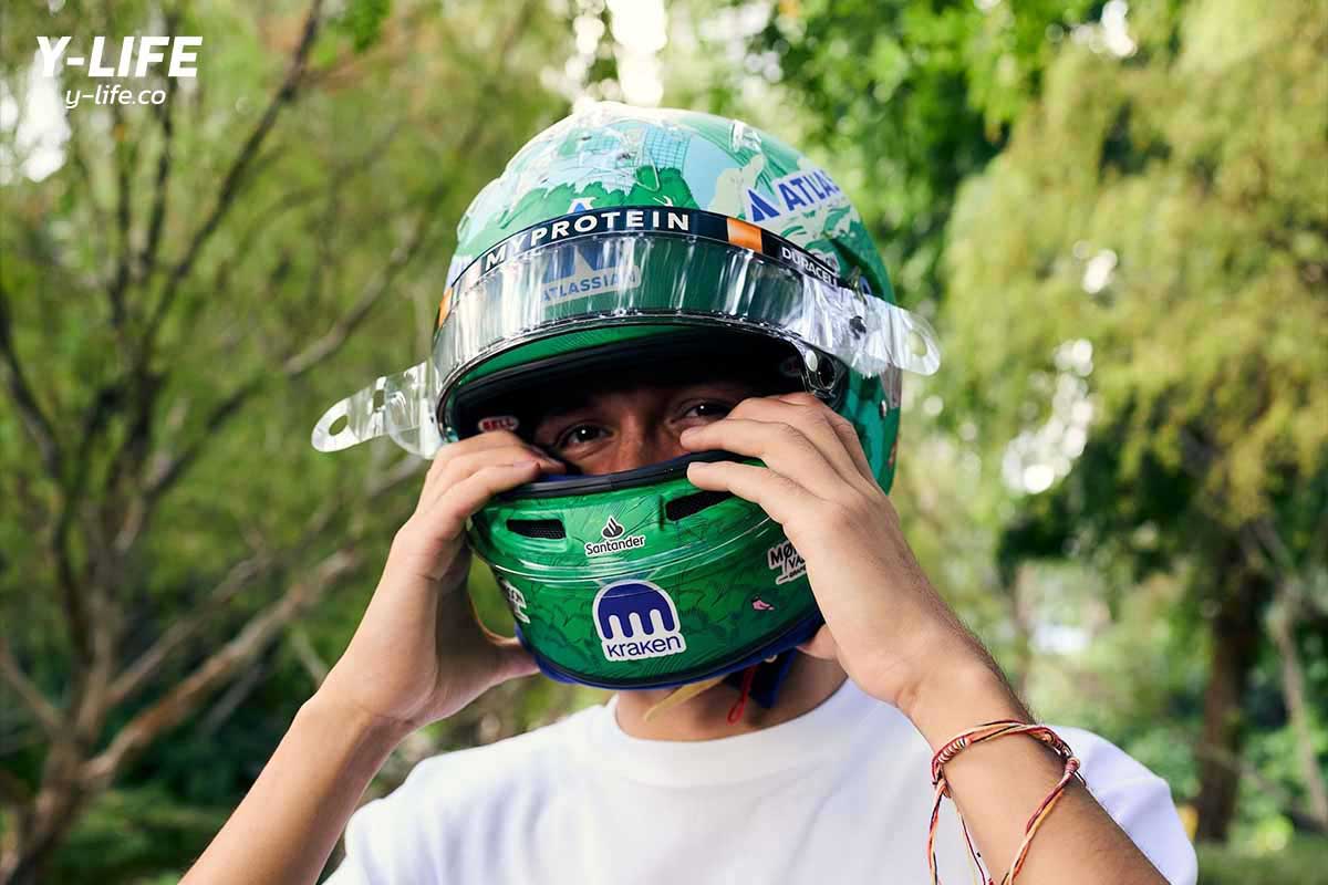หมวกกันน็อกใบนี้ออกแบบโดยคาร์ลอตตา เฟรเออร์ (Karlotta Freier) ถ่ายทอดแรงบันดาลใจจากลวดลายไทยและเอเชียที่สะท้อนถึงภูมิลำเนาของอัลบอนในเอเชียตะวันออกเฉียงใต้ โดยเขาจะสวมใส่หมวกใบดังกล่าวลงแข่งขันในรายการ สิงคโปร์กรังด์ปรีซ์ ระหว่างวันที่ 3–5 ตุลาคม 2568 การประมูลเริ่มต้นที่ 450,000 บาท (ประมาณ 14,100 ดอลลาร์สหรัฐ) เปิดแล้ววันนี้จนถึงวันที่ 15 ตุลาคม 2568 ที่ www.unicef.or.th/alex