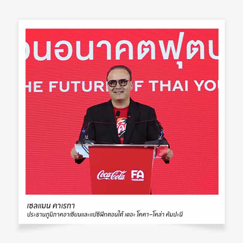 เซลแมน คาเรกา ประธานภูมิภาคอาเซียนและแปซิฟิกตอนใต้ เดอะ โคคา-โคล่า คัมปะนี กล่าวว่า “โคคา-โคล่า ภูมิใจที่ได้สนับสนุนกีฬาฟุตบอลมาอย่างต่อเนื่องทั้งในระดับประเทศและระดับโลก สำหรับประเทศไทย ฟุตบอลถือเป็นหนึ่งในกีฬาที่คนไทยหลงใหลมาทุกยุคทุกสมัย ความร่วมมือกับสมาคมกีฬาฟุตบอลแห่งประเทศไทย ในพระบรมราชูปถัมภ์ ในครั้งนี้จึงตอกย้ำถึงความมุ่งมั่นของเราในการสนับสนุนนักกีฬาเยาวชนและวงการฟุตบอล เยาวชนไทย ด้วยการนำ “โค้ก® คัพ” ลีกเยาวชน U-17 คืนสนามกลับมาอีกครั้งในปีหน้า เราดีใจที่ได้มีส่วนพัฒนา นักกีฬาฟุตบอลไทยรุ่นใหม่และเปิดโอกาสให้เยาวชนไทยได้แสดงศักยภาพ เพื่อทำตามความฝันของตนเองได้อย่าง เต็มที่”