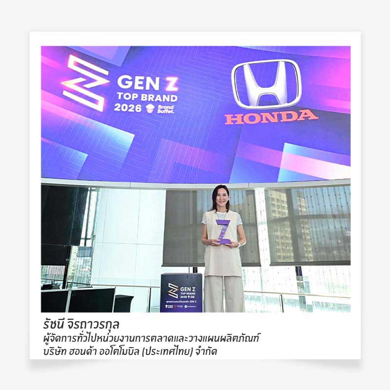 บริษัท ฮอนด้า ออโตโมบิล (ประเทศไทย) ตอกย้ำความเป็นแบรนด์ที่ Gen Z เทใจให้ ด้วยการคว้ารางวัล ‘GEN Z TOP BRAND AWARD 2026’ ในหมวด Automotive สะท้อนถึงความเชื่อมั่นที่ผู้บริโภคกลุ่มคนรุ่นใหม่มีต่อแบรนด์ฮอนด้าอย่างแท้จริง โดยเป็นผลจากการสำรวจเชิงลึกโดยเว็บไซต์ BrandBuffet สื่อด้านธุรกิจและการตลาด ร่วมกับ INTAGE Thailand บริษัทวิจัยการตลาดชั้นนำ และ Wisesight ผู้เชี่ยวชาญด้าน Social Listening ที่มุ่งเจาะลึกพฤติกรรมผู้บริโภคกลุ่มคนรุ่นใหม่ในยุคดิจิทัล ซึ่งอ้างอิงการรวบรวมข้อมูลจากกลุ่มตัวอย่างกว่า 3,000 คน ครอบคลุมทั้ง Gen X , Gen Y และ Gen Z จากทั่วประเทศ ครอบคลุมทั้งเชิงปริมาณและคุณภาพ เพื่อนำมาวิเคราะห์และประเมินถึงความแข็งแกร่ง รวมถึงความหมายของแบรนด์ในใจผู้บริโภค ที่จะสะท้อนทิศทางของตลาดและบทบาทสำคัญของกลุ่มคนรุ่นใหม่ในฐานะกุญแจสู่การสร้างการเติบโตของแบรนด์อย่างยั่งยืนในระยะยาว